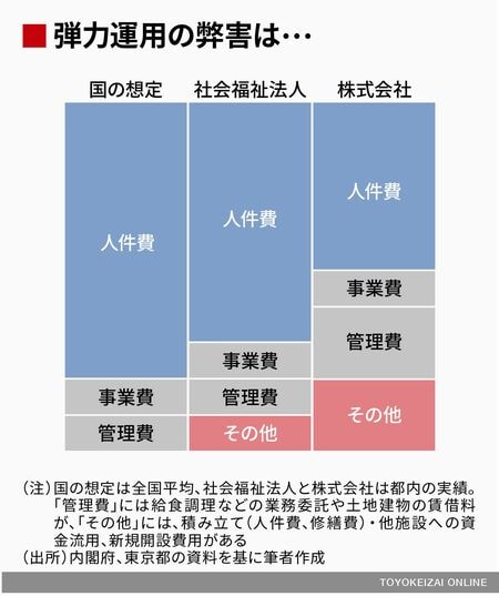 東京都は社会福祉法人と株式会社を比較するため、前述の集計結果で、定員数、職員の平均経験年数を同じ条件(定員66~76人まで、職員の平均経験年数5年)にして費目区分の割合を算出している。その数値を見てもやはり、人件費分が土地建物の費用に吸収されてしまっていることが窺える。預ける側、働く側にしてみれば、重要なポイントだ。
