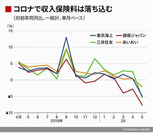 新型コロナウイルスの影響を受け、損害保険会社の売り上げが急激に落ち込んでいる。