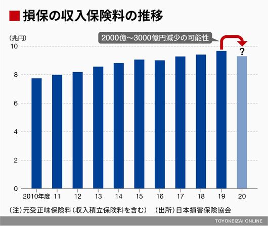 損保業界全体の収入保険料は2019年度で約9.6兆円。「新型コロナの影響が長引けば、2020年度の損保業界全体の保険料は2000億~3000億円減少してもおかしくない」。ある大手損保の関係者はこう話す。