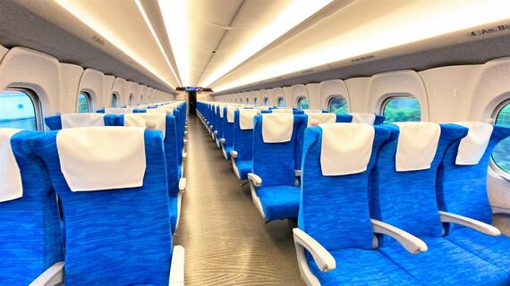 朝10時前の東京駅。「回送991号」と表示のある19番線ホームに、ピカピカの車体のN700Sが滑り込んできた。金色に輝く「S」の新しいロゴを横目に、まずは普通車に乗り込む。