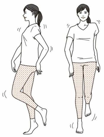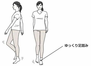 ・姿勢を保ったまま、その場でジョギングする。足の痛みがある人や筋力の低下している人は小刻みに足踏みする程度でもOK