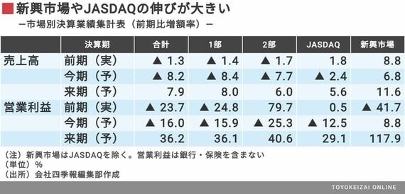 業績の実績や予想を市場別でも集計した。IT関連企業の比較的多い新興市場が8.8%の増益予想と健闘している。業績予想の伸び率の高い企業を並べてみると、新興市場やJASDAQに上場する企業が数多く上位にランクインしているのがわかる。