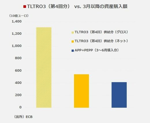 上述のとおり、TLTRO3におけるネット供給額は5400億ユーロを超える。市場参加者やメディアのヘッドラインは資産購入の規模や中身に注目しがちだが、今回の供給規模は3月以降に実施されてきたECBの資産購入総額よりも大きい。