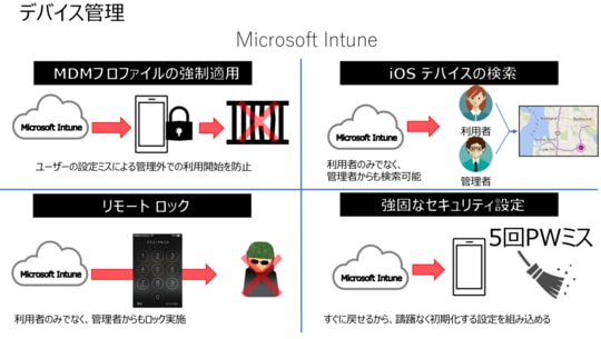 浅野井氏 緊急事態宣言を機に、社員が在宅からインターネット接続できる環境と、デバイスを選ばず「UniTalk」を使用できる環境を整えるべく、約500台のスマートフォンを追加導入しました。これにより管理台数が倍増するため、管理ツールである「Microsoft Intune」の設定を見直しました。「Microsoft Intune」はクラウド経由で管理者がセキュリティー管理できるサービスで、仮に社員がデバイスを紛失したとしても、外部からは企業や個人の情報を盗み見ることができず、管理者による位置検索も可能になります。社員がどこで働いていても、情報漏洩などのリスクを軽減させ、安全に業務を遂行することができるツールとして使用しています。