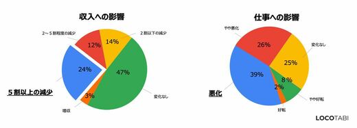収入が「5割以上減少」した人が全体の24%、「5割から2割減少した」人は12%、「2割以下減少」した人は14%と、あわせて50%にのぼった。