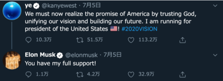 独立記念日に当たるアメリカ時間7月4日、ウェストはツイッターで「2020年の大統領選に立候補する」と宣言。リアリティ番組のスターで妻のキム・カーダシアン・ウェストは、この投稿にアメリカ国旗の絵文字を返信して支持を表明した。やはりお騒がせ好きなテスラのCEO、イーロン・マスクも、「私は完全に支持します」とツイートしている。
