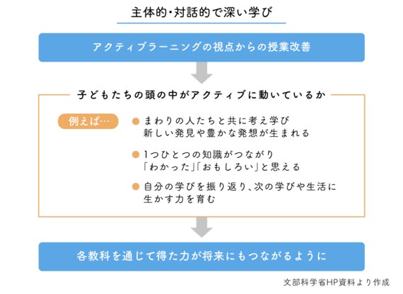 新学習指導要領では、何を学ぶかだけでなく、どのように学ぶか、といった観点からも見直しが行われた。先生の講義形式の話を生徒が聞くという受け身の授業だけでなく、グループで話し合うなどの対話型学習を通じて、児童生徒が主体的に、より深く学べるようにする「アクティブラーニング」(能動的学習)を推進する。また、各校が編成する教育課程(カリキュラム)は、よりよい社会をつくるという目標を社会と共有し、求められる資質・能力を明確化。教育課程の実施にあたっては、地域社会と連携、協働する「社会に開かれた教育課程」という理念を提唱した。