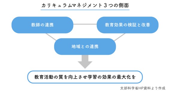 教科横断的な視点も取り入れて組み立てた教育課程は、編成、実行、評価、改善のPDCAサイクルを回しながら、その質を高めていく「カリキュラムマネジメント」の手法を取り入れることも提起している。これらの取り組みにより、①学びに向かう力や人間性、②実社会を生き、働くための知識や技能、③未知の状況にも対応できる思考力、判断力、表現力――の3つの力をバランス良く育み、子どもたちが将来、社会に出てからも役立つ学びを目指すとしている。