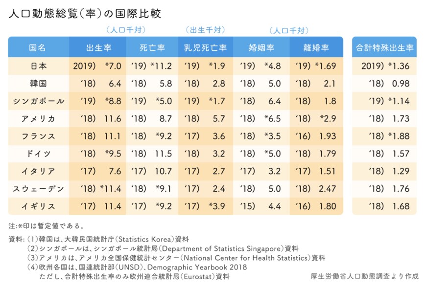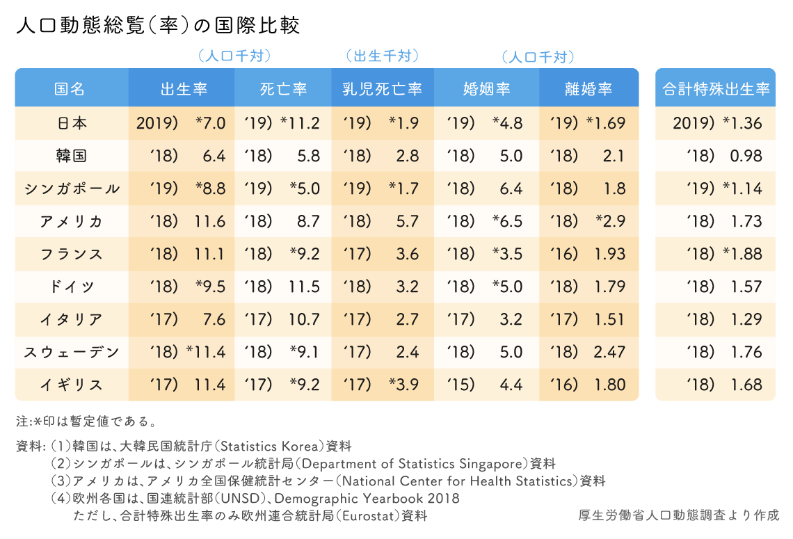 一方、注目したいデータもある。日本の婚姻件数は2018年から1万2484組増え、59万8965 組と7年ぶりに増加した。婚姻件数は、1972年の109万9984組をピークに、1975年から増加と減少を繰り返しながら推移、2013年から減少が続いていた。ただし、初婚の妻の年齢は、2018年に比べ、20~24歳では低下し、25~39歳では上昇するなど、年齢の低い者の割合が低下し、年齢の高い者の割合が上昇する傾向が続く。平均初婚年齢は、夫31.2歳、妻29.6歳。2014年から2018年までは夫31.1歳、妻29.4歳が続いていたが、夫妻ともに6年ぶりに上昇している。都道府県別に見ると、平均初婚年齢が最も低いのは、夫は宮崎県で30.1歳、妻は岡山県で28.8 歳。最も高いのは夫妻ともに東京都で夫32.3歳、妻30.5歳となっている。婚姻件数は増えているものの、婚姻の高齢化が進んでおり、少子化の改善になかなかつながらない要因と指摘されている。