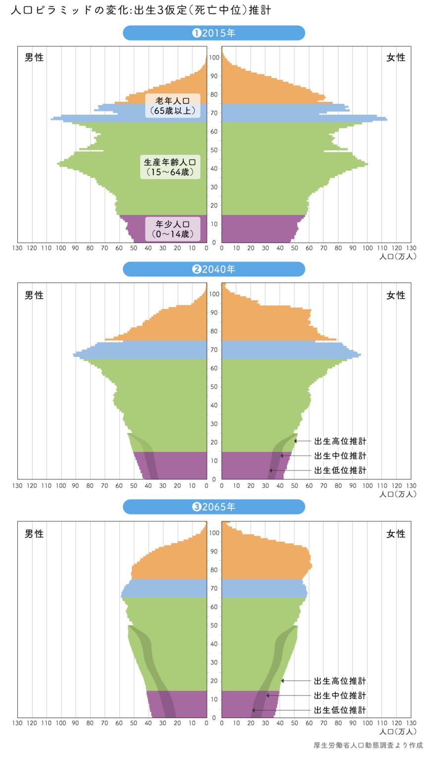 2015年の国勢調査によれば、日本の総人口は1億2709万人。これを基に国立社会保障・人口問題研究所が導き出した出生中位推計による将来推計人口を算出した結果、2040年は1億1092万人、2053年には1億人を割って9924 万人となり、2065年には8808 万人になると推計されている。しかし、すでに人口減少のペースはこの推計を上回っている。