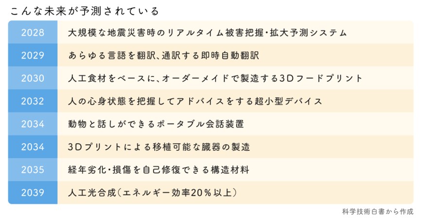 例えば、2028年に「大規模な地震災害時のリアルタイム被害把握・拡大予測システム」、2029年には「あらゆる言語を翻訳、通訳する即時自動翻訳」、2034年では「3Dプリントによる移植可能な臓器の製造」などの科学技術の社会的実現時期が示されている。ちなみに同年には「動物と話しができるポータブル会話装置」も実現するというのだから面白い。