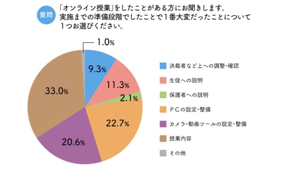 アンケートでは、「オンライン授業の経験がある」と回答しているのは、全体の16.2%の97人。さらに、「その準備段階でいちばん大変だったこと」を聞くと、43.3%が「PC」や「カメラ・動画ツール」の設定など、IT機器の整備に苦労したと答え、33%が「授業内容」の準備に苦労したと回答している。