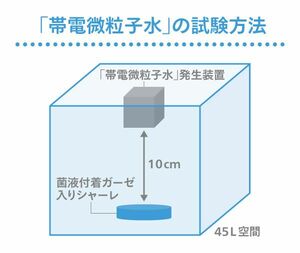 ※2 45L空間にて、床面から10cmの位置に「帯電微粒子水」発生装置を設置し、菌液を滴下したガーゼをシャーレに配置。所定時間「帯電微粒子水」を曝露し、菌数をカウントし抑制率を算出した。試験対象は、細菌が、黄色ブドウ球菌(MRSA)、リステリア菌、枯草菌、スメグマチス菌、ノカルディア菌、淋菌、サルモネラ菌、インフルエンザ菌、カンピロバクターの9種。真菌が、マラセチア菌、白癬菌、スポロトリックス、エクソフィアラ、ユミケカビ、赤色酵母(ロドトルラ)、クロカビ(クラドスポリウム)、アカパンカビ、スエヒロダケの9種