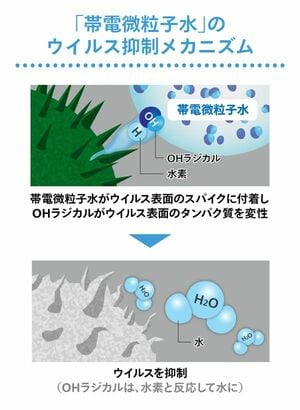 メカニズムを簡単に説明するとこうだ。帯電微粒子水がウイルスに届くと、OHラジカルがウイルスのタンパク質と結合し、タンパク質から水素(H)を抜き取る。つまり、酸化反応を起こすことでウイルスのタンパク質を変性させるのだ。さらに、水素と結合したOHラジカルは水になって空気中に戻る。
