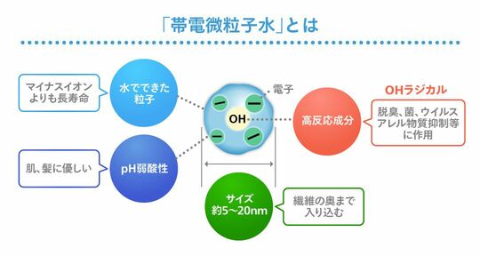 帯電微粒子「水」といっても、実際には空気中の水に高電圧を加えることで生成されるナノサイズ(約5~20ナノメートル)の微粒子イオンだ。OHラジカルと呼ばれる高反応成分がこのナノサイズの微粒子水に含まれており、微細なために繊維の中にまで入り込むことが可能だという。脱臭や除菌効果が高いだけでなく、水分が豊富で弱酸性なため、人の肌や髪に優しいという性質も持つ。