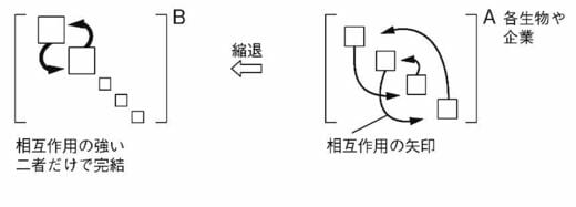 そしてここではそれらの食物連鎖や相互依存関係が矢印で示されており、下の図Aのようにそれらが全体を回ることで、多数の生物や企業同士の相互依存関係が一種の大きな生態系を作っているわけである。