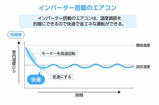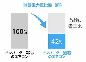 インバーター技術を搭載していれば、エアコンが設定温度になるまでフルパワーで動作し、設定温度に達したら自動で低速運転に切り替わるため、消費電力の低減につながるというわけだ。インバーターエアコンなら、インバーターなしのエアコンに比べて、消費電力を約58%も削減できる(ダイキン調べ)。