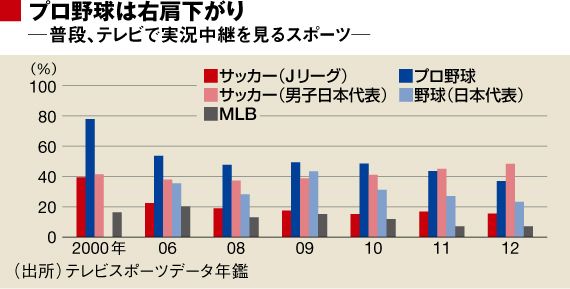 「テレビスポーツデータ年鑑」の調査によると、「普段、テレビで実況中継を見るスポーツ」は、2000年にはプロ野球が78%、サッカー日本代表が41.4%の人数割合だったものの、2011年には前者が43.6%、後者が45%と逆転する(上表参照。ちなみに、同年のJリーグは16.8%、野球の日本代表戦は27.1%)。ワールドカップ(W杯)南アフリカ大会が開催された2010年には、テレビでの報道件数でサッカーが野球を上回った。