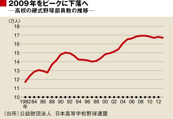 一方、高校の硬式野球部員数は近年まで右肩上がりで上昇してきた。しかし、2009年にピークを迎えて以降、減少に転じる(右グラフ参照)。これまでは、幼少の頃にグローブを手にした少年が辞めずにプレーしてきた結果、高校野球の部員数が増えてきた。だが、いよいよ人口減少率が高まり、高校野球部員数も下降し始めている。おそらく今後は、減少の一途をたどるだろう。