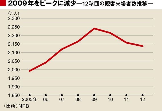 そうした事情を総合すると、近年の日本において、野球は敷居の高いスポーツになっていると言える。コア化が進む野球界で同時に懸念されるのは、野球にまったく興味を示さない層が増えていることだ。事実、プロ野球12球団の観客動員数は2009年をピークに減少している(右グラフ参照)。今季は千葉ロッテマリーンズの本拠地QVCマリンフィールド、西武ドームで閑古鳥の泣く状況だ。