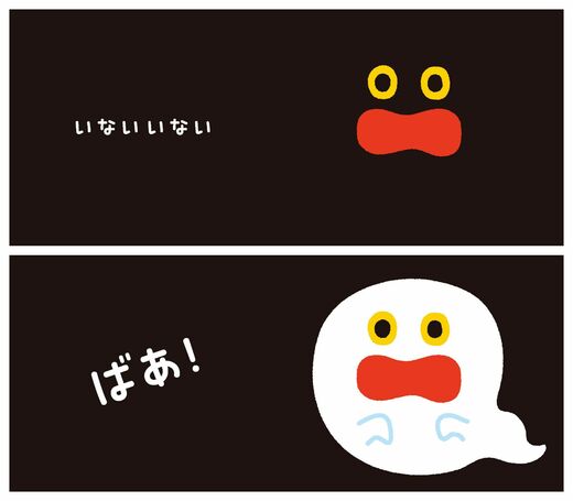 書いてある⾔葉は「いないいない」と「ばあ!」だけでも、読み⼿が声のトーンや抑揚、「ばあ!」のタイミングなどを変えることで、予想のしやすさが変わり、さらに多くのバリエーションをつけることができます。この読み⼿の関わりも、「いないいないばあ」という遊びの重要なポイントです。