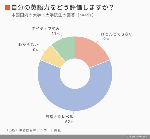 自分の英語能力をどう評価するのか聞いてみた。「あなたは自分の英語能力をどのレベルだと思いますか?」の設問に対する回答は、「ネイティブ並み」と答えたのが11%、「日常生活レベル」との回答が62%と約7割が英語に困らないレベル、「ほとんどできない」は約2割であった。ちなみに早稲田大学で中国人留学生に対して同じアンケートをしたところ、「日常生活レベル」の回答が7割に増え、「ネイティブ並み」と合わせると約8割が英語に困らないレベルであった。
