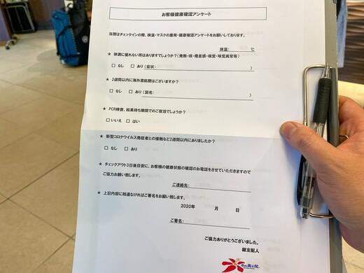まずチェックインの手続きを取る前に、ホテルスタッフが検温し、体温を確認された。その後、「お客様健康確認アンケート」への記入を求められ、体温の記入及び現在の体調、海外渡航歴(2週間以内)、PCR検査の結果待ちの状態かどうかなどのほか、新型コロナ発症者との接触についての質問に答え、さらに電話番号を記入したのち、最後に署名をして提出した。
