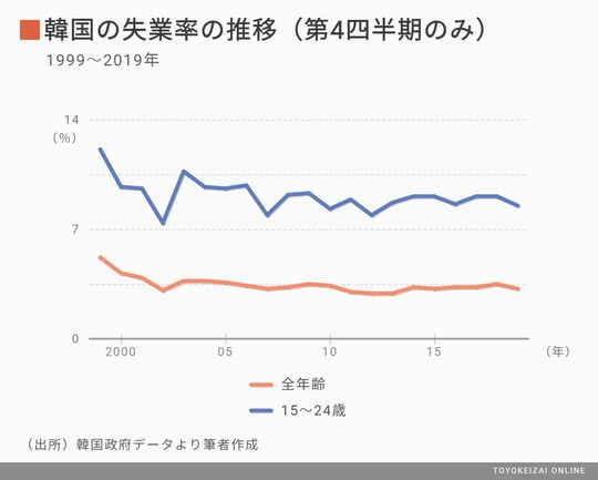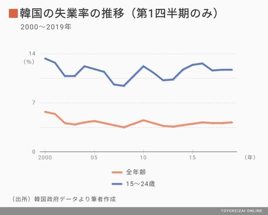 2018年と2019年の第1四半期には、全体の失業率はそれぞれ4.1%と4.2%でした。2000年からの平均が4.2%ですので、失業率の上昇は「例年並み」と言えます。15~24歳の失業率の失業率は2018年も2019年も11.7%でした。2000年からの平均値は11.4%ですので、多少高いだけです。