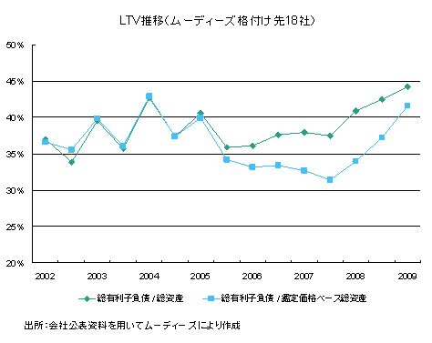 一方で、ここ数年上昇を続けてきた不動産の資産価格が下落基調に転じたことによって、市場価格ベースのレバレッジも上昇を早めているだろう。保有不動産ポートフォリオの投資ビンテージが比較的新しい資産に偏っている発行体ほど、市場価格ベースのレバレッジが上昇しやすいだろう。毎期更新されている鑑定価格を一つの目安として比較すれば、そのような発行体においては、既にポートフォリオの簿価に対して鑑定価格が下回る状況になっている。