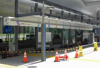 レインボーカラーのラインをあしらった白い柱にガラスの壁、そして屋根の端には「B」の文字をかたどったシンボルマーク。新交通「ゆりかもめ」新橋駅の高架下には、すでに東京BRTの停留施設が姿を現している。「鉄道並みのわかりやすさ」を目指すというだけあって、近代的な路面電車の乗り場を思わせる施設だ。