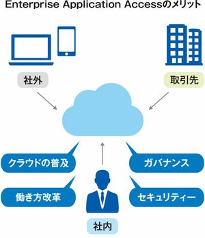 山野 「Enterprise Application Access」は、従業員や業務委託先、パートナー企業など許可されたユーザーのデバイスだけを、場所を問わず社内システムとクラウドサービスへアクセスできるよう一元管理するサービスです。どの範囲まで社内システムやSaaSを利用できるのか、個々のユーザー別にアクセス権を制限できるのも特徴。セキュリティーを担保するために非正規社員の在宅勤務を不可とする、いわゆる「テレワーク格差」も解消できます。社内ネットワーク全体へのアクセスは必要なく、一度ユーザーを認証してからクラウドサービスへつなぐので安心ですし、VPNを使わないためキャパシティーを気にする必要もありません。