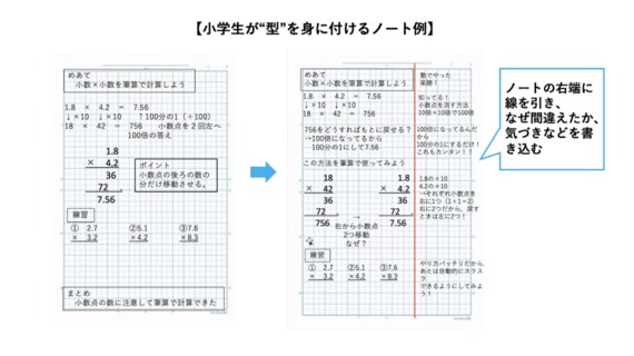 「例えば、小学生なら赤線でノートを左右に区切り、左側には自分の解答を、右側には間違った理由、問題を解いた際の気づきなどを書くのです。そうすることで、ただ問題を解くだけではなく、自分の強みや弱み、できていない部分などを可視化でき、次のステップへとつなげていくことができます」