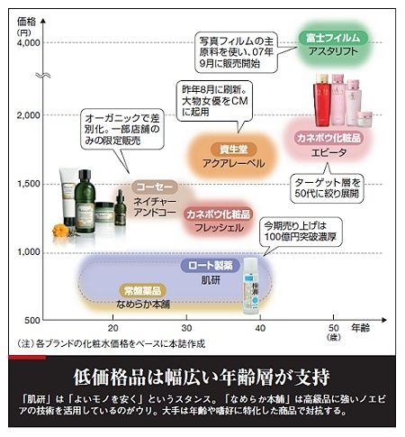 主力である2000円以上の化粧品が苦戦する一方で、「3ケタ(1000円未満)に強いブランドがない」(資生堂の原田康彦専務)ために低価格品の需要を取り込めていないことが要因だ。