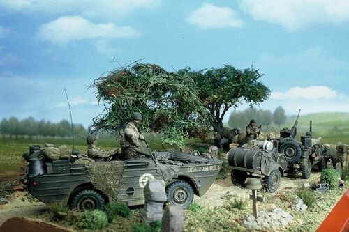 「これは、イタリア南部でアメリカ兵士たちが羊の群れに道をふさがれている場面です。その羊飼いに英語で敵情を質問するも、彼は、『俺んちのワインはうまいから寄っていけよ!』とわからぬイタリア語でまくしたてられ、困る米兵たちをイメージして作りました。こういう牧歌的なミリタリー模型はなかったので、当時は日本だけでなく海外でも話題になりましたね」
