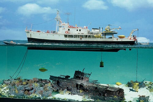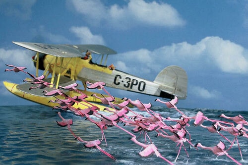 ほかの代表作には、青い空の下の海洋調査船と、蒼い海に眠る旧ドイツ軍潜水艦の、生と死を思わせるコントラストが印象的な「カリプソ号」。飛行機に驚き飛び立つフラミンゴの群れの躍動感が伝わってくる「フラミンゴ」など。どの作品にもドラマがあって、ずっと眺めていても見飽きない。