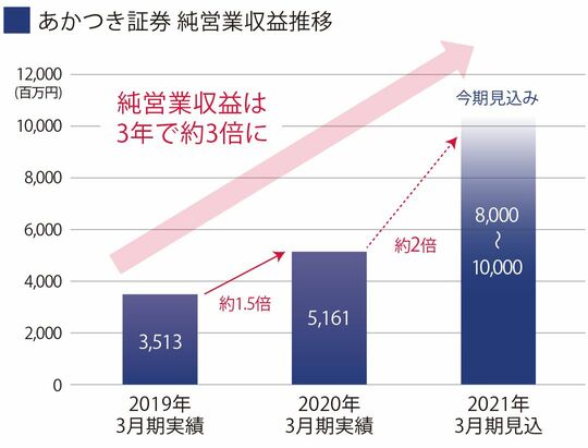 このような現状においても、「2020年3月期決算では純営業収益が約51億円と、前期の約35億円から約1.5倍と大幅な増収を達成しました。今期(21年3月期)の営業収益は80億~100億円を見込んでいます」と話すのは、あかつき証券の代表取締役社長、工藤英人氏だ。