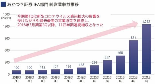 こうした流れの中で、あかつき証券の20年3月期IFA部門の営業収益は約19億円と前期比約3.5倍に拡大し、18年第3四半期から11四半期連続の増収を達成している。