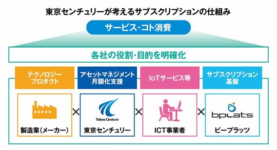サブスクビジネスには、「商品を提供するメーカー」「アセットホルダーのリース会社」「顧客とのつながりを担うICTベンダー」「請求・課金のプラットフォーム」の4つのプレーヤーが必要になる。東京センチュリーは、これらのプレーヤーをつなぐハブとしての役割に強みがある。