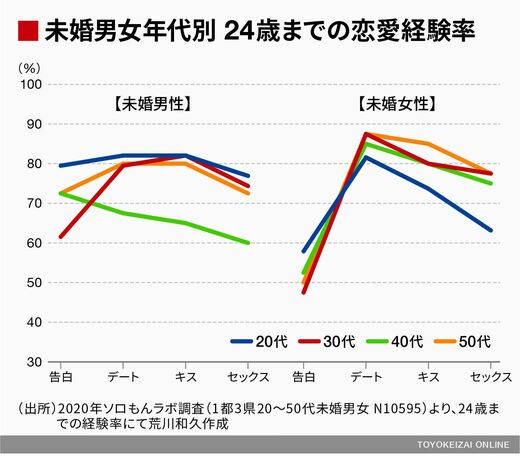 これを見ると、意外なことがわかります。未婚男性に限れば、20代の若者も、30代も50代も、ほぼ24歳までの経験率に大きな差はありません。決して、若者が恋愛経験をしていないわけではないのです。