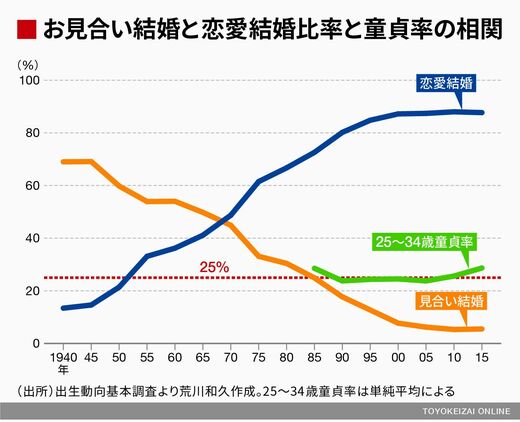その後、お見合い比率は5%台まで激減します。直近の25~34歳の未婚男の童貞率は29%ですが、彼らがアラフィフとなる20年後には、男の生涯未婚率(50歳時未婚率)は約30%になると推計されています。数字のつじつまは合っています。