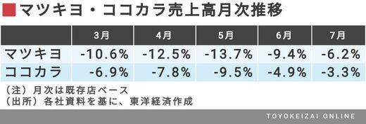 しかも、上記4~6月の期間以上に両社の売り上げが持続的に停滞するかというと、そんなこともない。両社の売り上げは7月にきて、回復基調になっている。3~7月の両社の月次は以下のとおりだ。