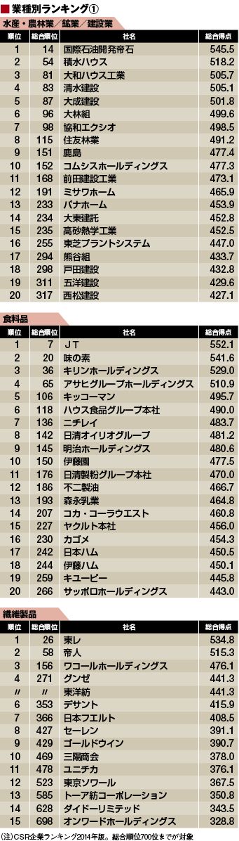 信頼される会社を、複数のデータから見つけるのがCSR企業ランキング(総合)。この総合ランキング、部門別ランキングに続き、今回は「所属業種別から見たランキング」をお届けする(金融を除く。同業界は別途近々発表予定)。