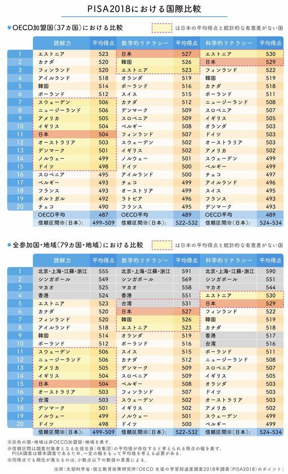 PISAとは、OECDが79カ国の15歳を対象に読解力、数学的リテラシー、科学的リテラシーの能力について、00年から3年置きに行っている生徒の国際学習到達度調査だ。日本はいずれも上位に位置しているものの、順位が上がったり、下がったりするたびに話題になり、世界の国々もその結果に一喜一憂している。00年にフィンランドがPISAで世界一となり、フィンランドへの注目が一気に高まったことを覚えている人も多いだろう。