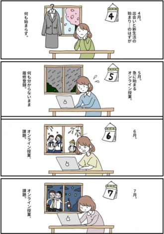7月中旬、前出の女性が「私と同じ」と胸を打たれたマンガがSNSに登場した。美大1年生のmakiさん(18)が描いた「大学生は、いつまで我慢をすればいいのでしょうか。」だ。多くの共感を呼び、「いいね」が40万件つき、17万回リツイートされた。