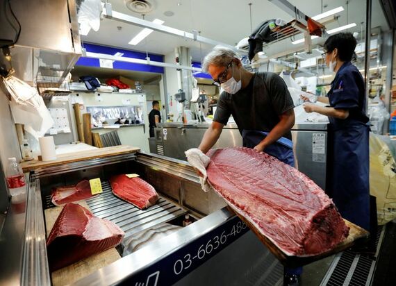 [東京 8日 ロイター] - 世界最大規模を誇る日本のマグロ市場が新型コロナウイルスのパンデミック(世界的な大流行)による大打撃にあえいでいる。水産物を扱う広大な豊洲市場の卸売業者らやマグロ料理の飲食店は事業の存続を賭け、待ったなしの対応を迫られている。