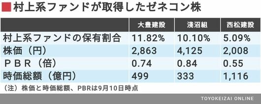 株価が割安な点でも共通する。大豊建設の9月8日時点の株価は2794円。PBR0.73倍で、時価総額487億円にすぎない。西松建設は株価1993円、PBR0.55倍で、時価総額は1107億円。淺沼組は株価4270円、PBR0.87倍、時価総額344億円だ。村上系ファンドにとっては、現預金が豊富で割安となれば”狙いやすい水準”と言える。