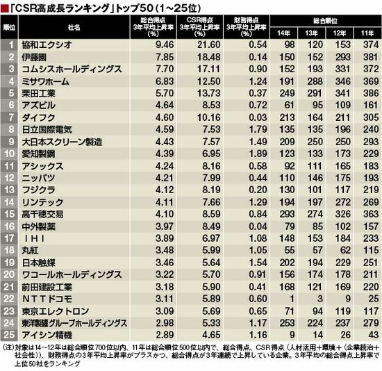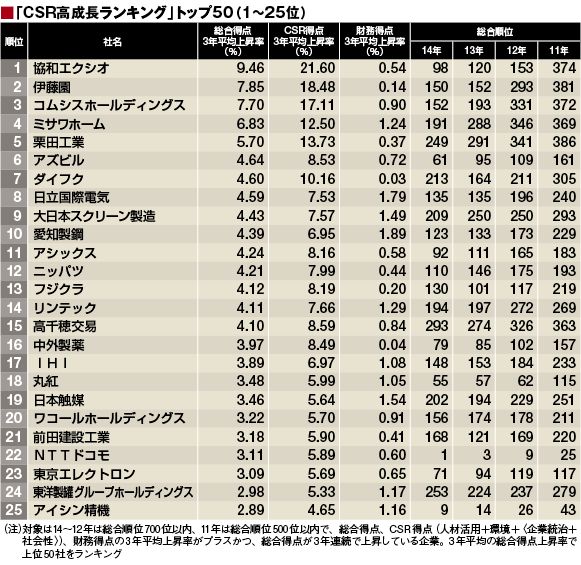 CSR高成長ランキングには、2011年から14年までの4年間のCSR企業ランキングの総合得点を用いる。各年の上昇率を平均して算出した3年平均上昇率をもとに、総合得点が3年連続でアップした企業を対象にランキングを作成した。CSR得点、財務得点も同様の方法で3年平均上昇率を算出している。それではランキング上位50社を見てみよう。