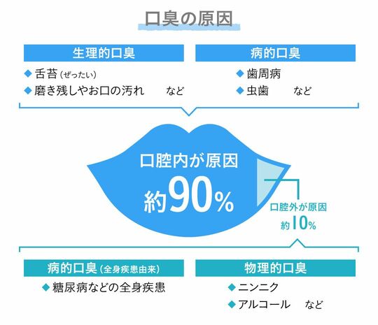 口臭は原因別に分類すると、磨き残しや舌苔(ぜったい)による生理的口臭と、虫歯や歯周病による病的口臭の2つに分けられ、これらに対処するためには、①原因菌、②舌苔や磨き残しなどのタンパク質、③菌がタンパク質を分解することで発生する悪臭物質の3要素に対応する必要がある。そこで、ブレスラボには、口臭の原因菌に対する殺菌成分、歯肉の炎症を抑える抗炎症成分、さらに臭いの原因物質を吸着する「におい吸着成分」※1を配合した。