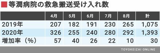 この東京ルールは、今年に入り3月までは1日約20件発動されていたが、新型コロナ感染が拡大した4月から5月にかけて急増し、1日最大120件程度に達した。それに伴い、救急搬送件数で年間2700件~2800件程度の等潤病院で4月、前年比約6割増となった。