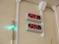 「上の数字が校庭の、下の数字は体育館の熱中症指数を表しています。どちらかが警戒レベルに達すると、ランプが光ってブザーが鳴ります」